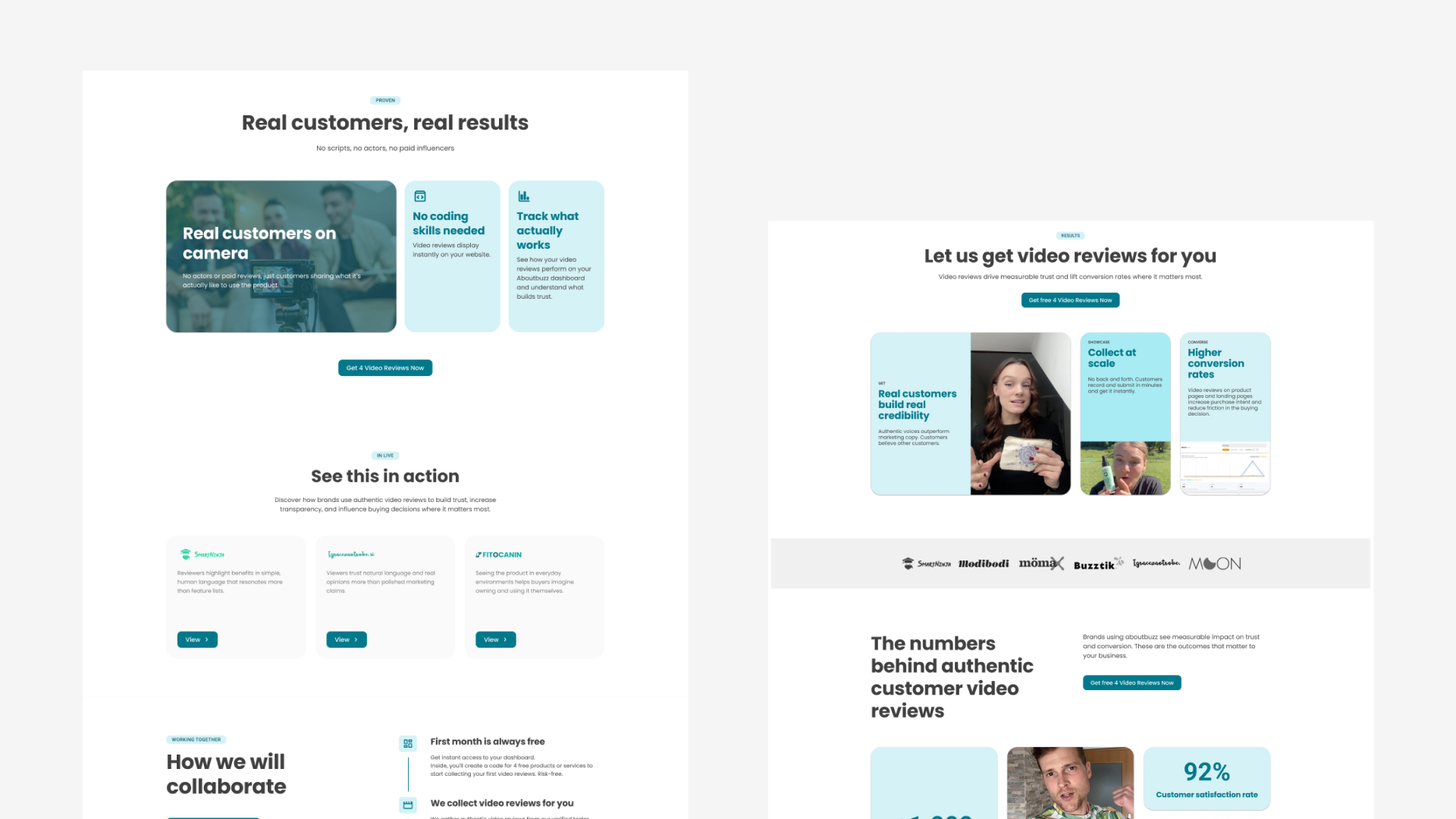 I synthesized research findings into actionable insights that guided the website’s structure, content strategy, and user flows. The insights ensured that both potential reviewers and business clients could quickly find relevant information and complete their goals. They also helped define the messaging that builds trust, showcases the benefits of video reviews, and positions the service as a credible, engaging solution for B2C marketing.